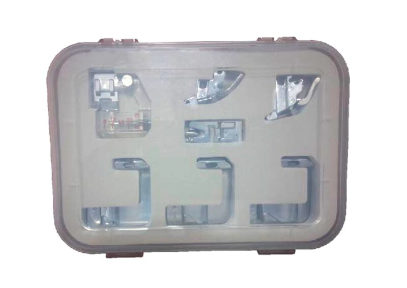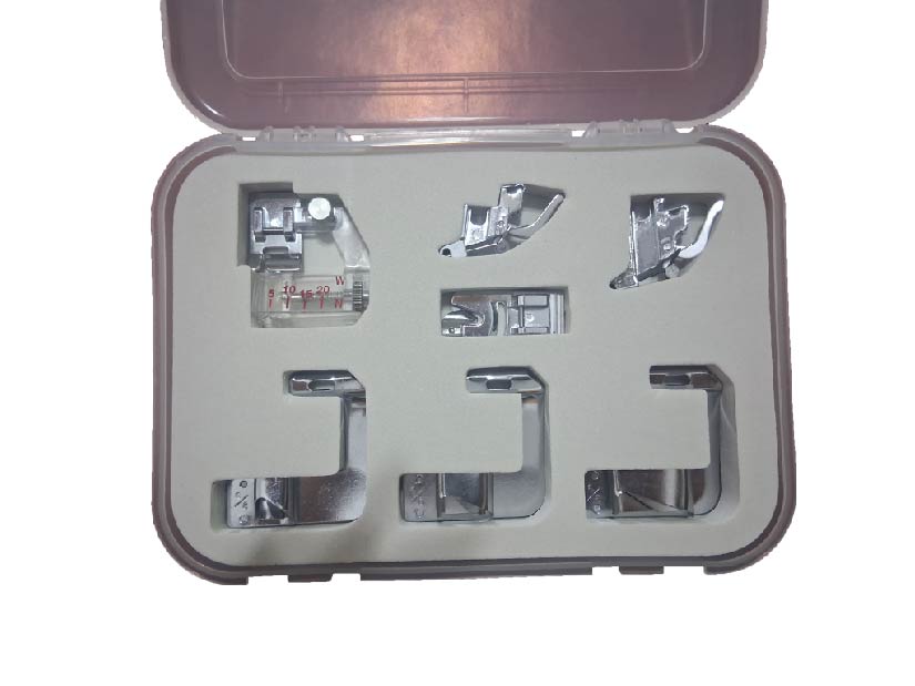 Caja organizadora, con base y prénsatela para ruedos, este set es completo va perfecto con todos los modelos de maquinas familiares, incluye 2 medidas de soporte, guías de dobladillo en distintos tamaños, y boquilla para colocar bies regulable